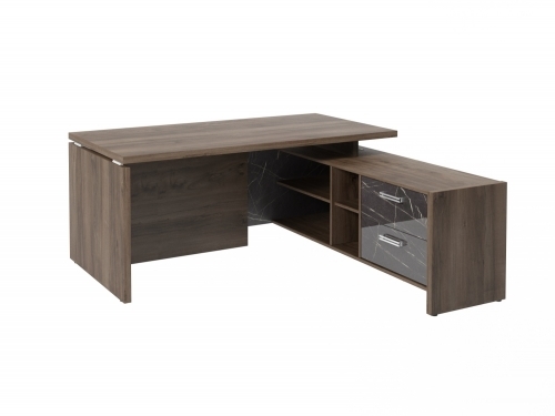 Столешница, бок стола и бок тумбы выполнены из ЛДСП толщиной 38 мм. Цвет - "Орех Пацифик Табак". Кромка 2 мм.